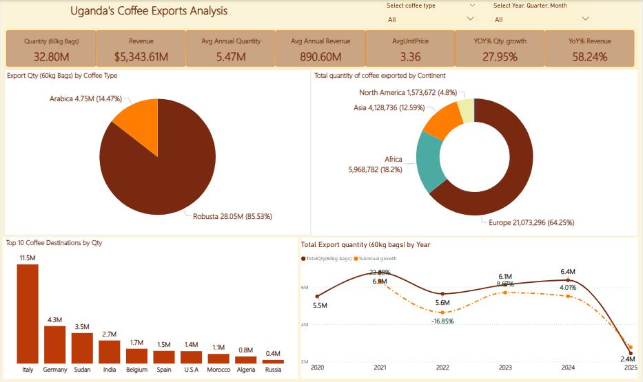 This project analyzes Uganda's coffee export performance. The goal is to analyze trends in export volumes and Export revenue with insights segmented by coffee type. It also explores the Top Coffee destinations, Top Exporting companies and Top Coffee Buyers. The dasboard will updated as new monthly data is made available on the UCDA website.